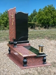 Вертикальна стела з плавними лініями гармонійно поєднується з декоративною червоною гранiтною вставкою, оздобленою хрестом, що символізує віру, пам’ять та шану. Комплекс доповнений гранітною плитою, тумбами та лампадкою.